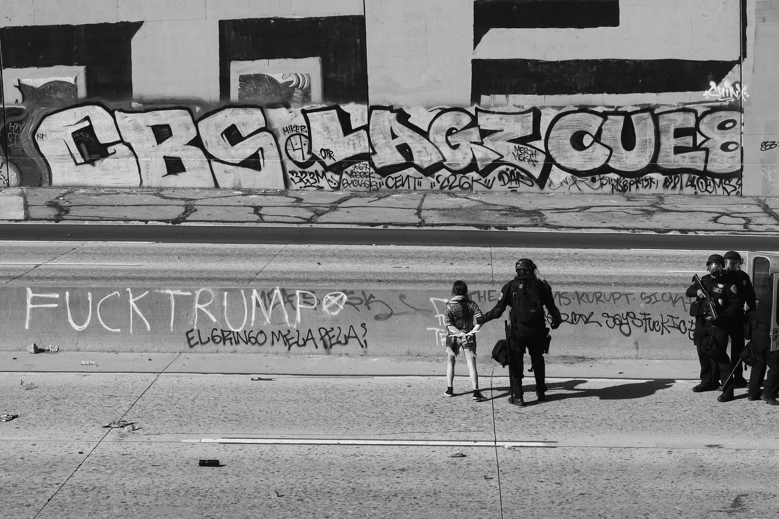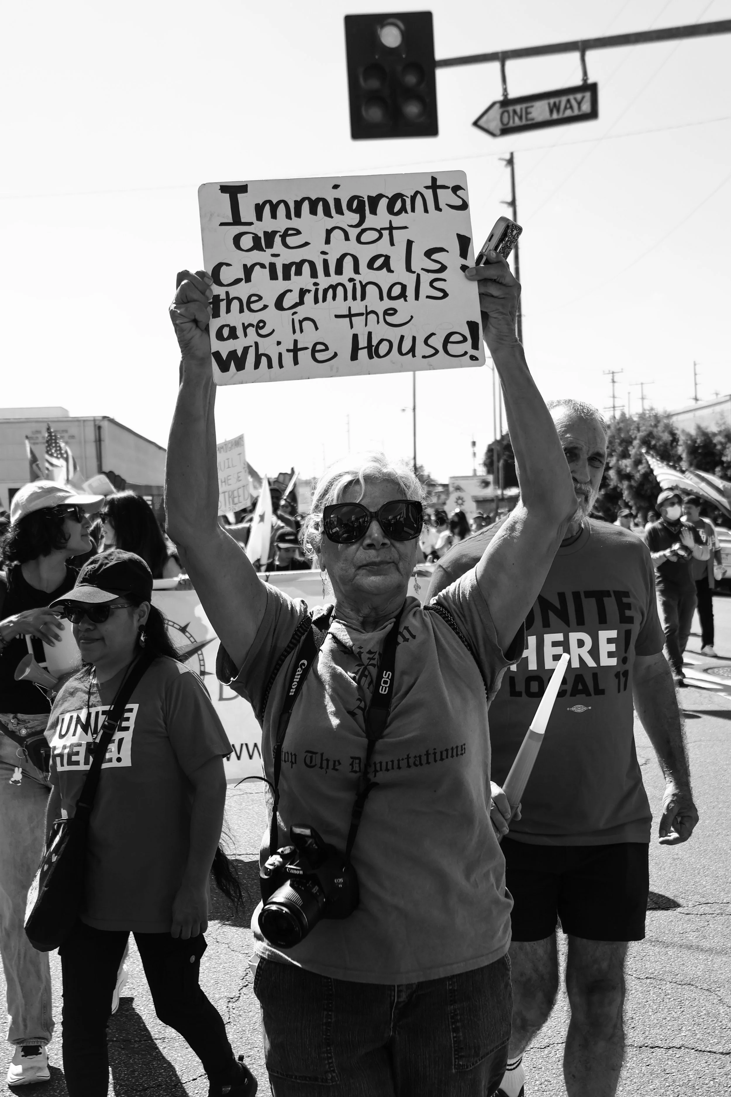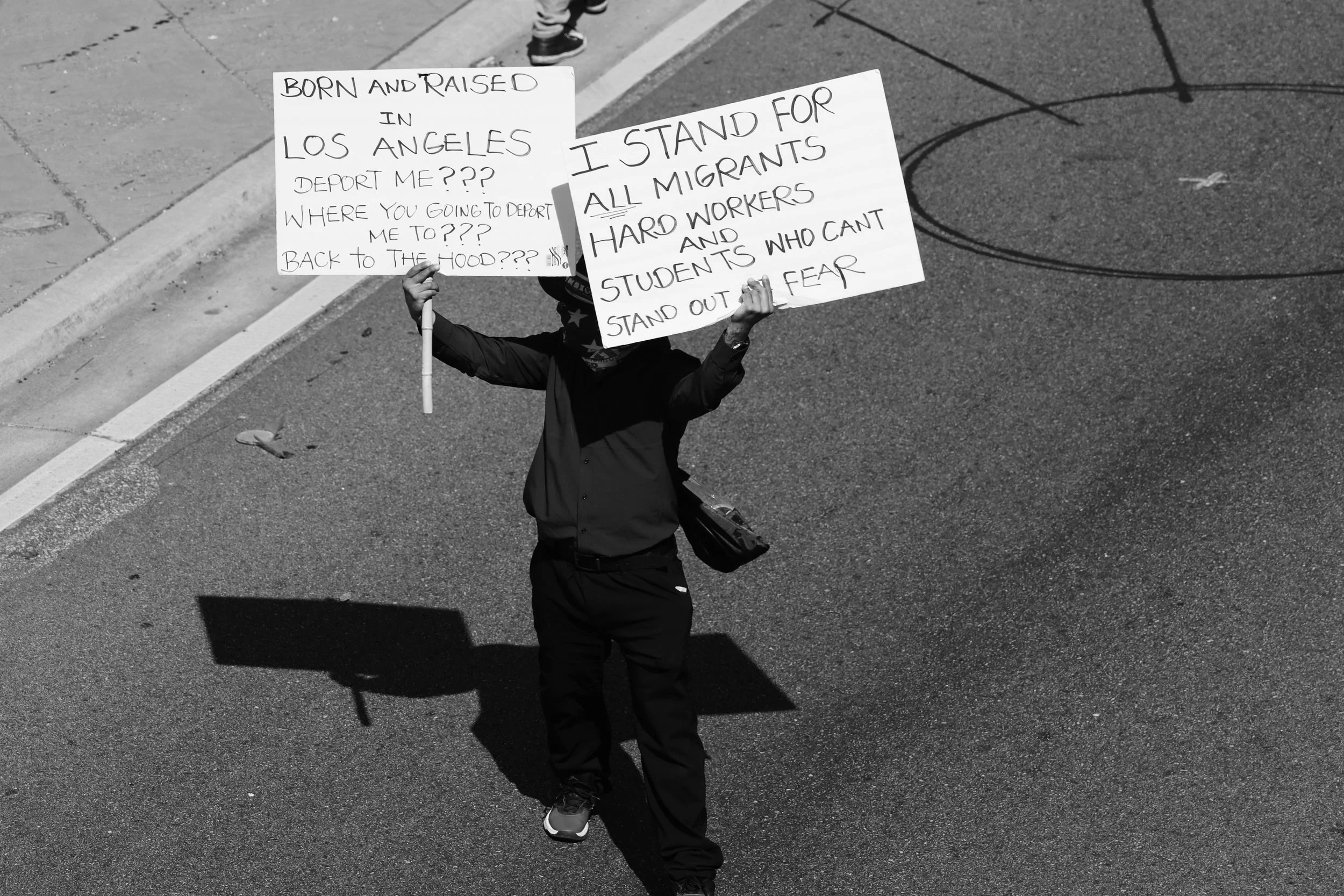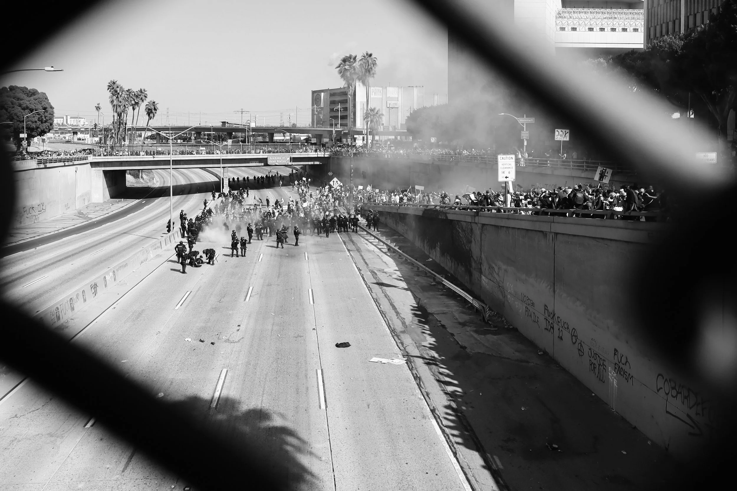 These photographs were taken throughout Los Angeles during the height of nationwide protests against the Trump administration’s anti-immigrant agenda. From freeway shutdowns to downtown marches, communities rose in collective resistance to denounce ICE raids, mass deportations, and the inhumane treatment of immigrants in detention.