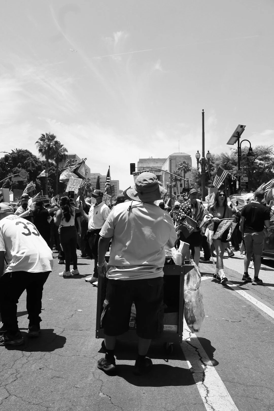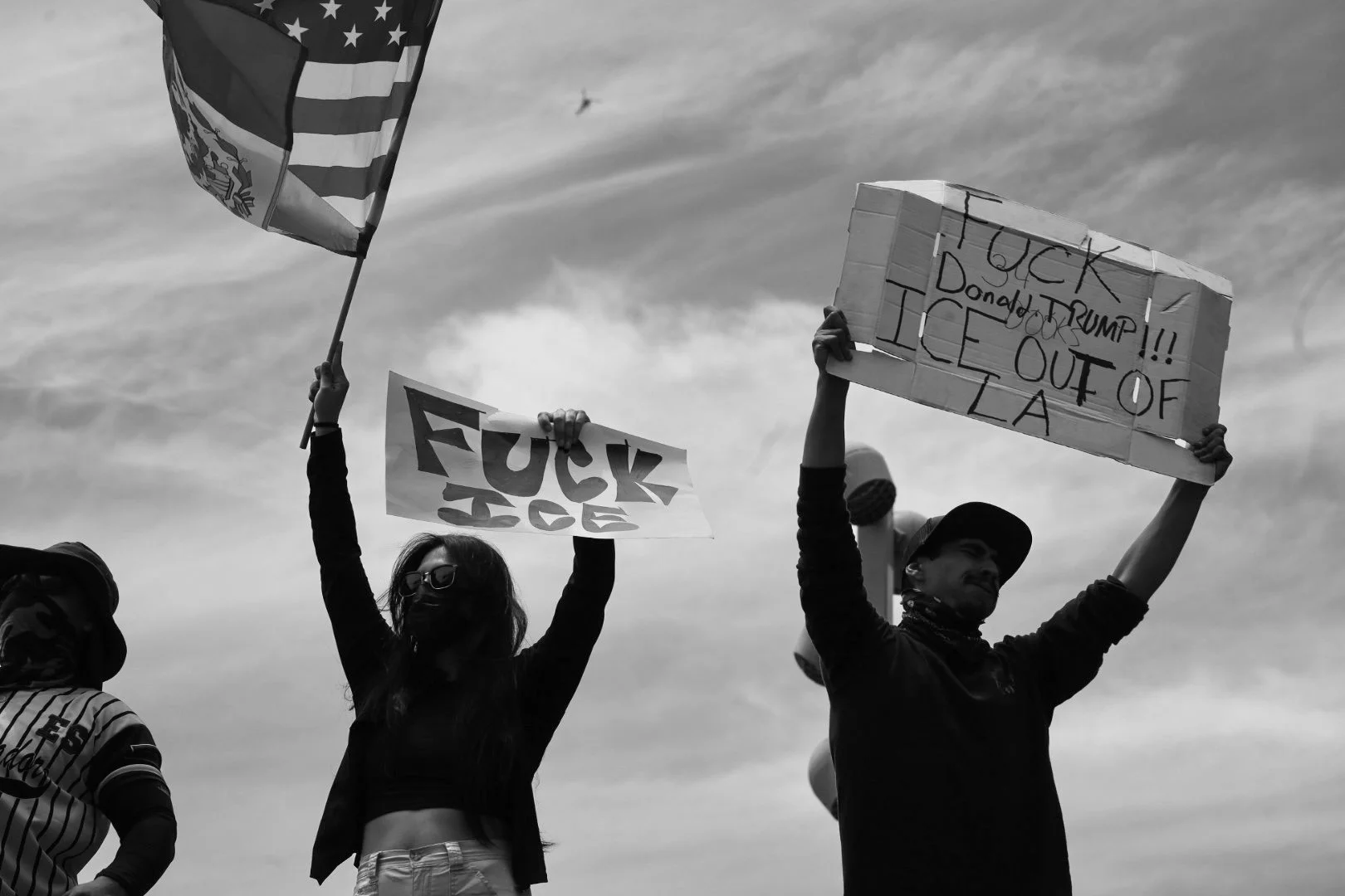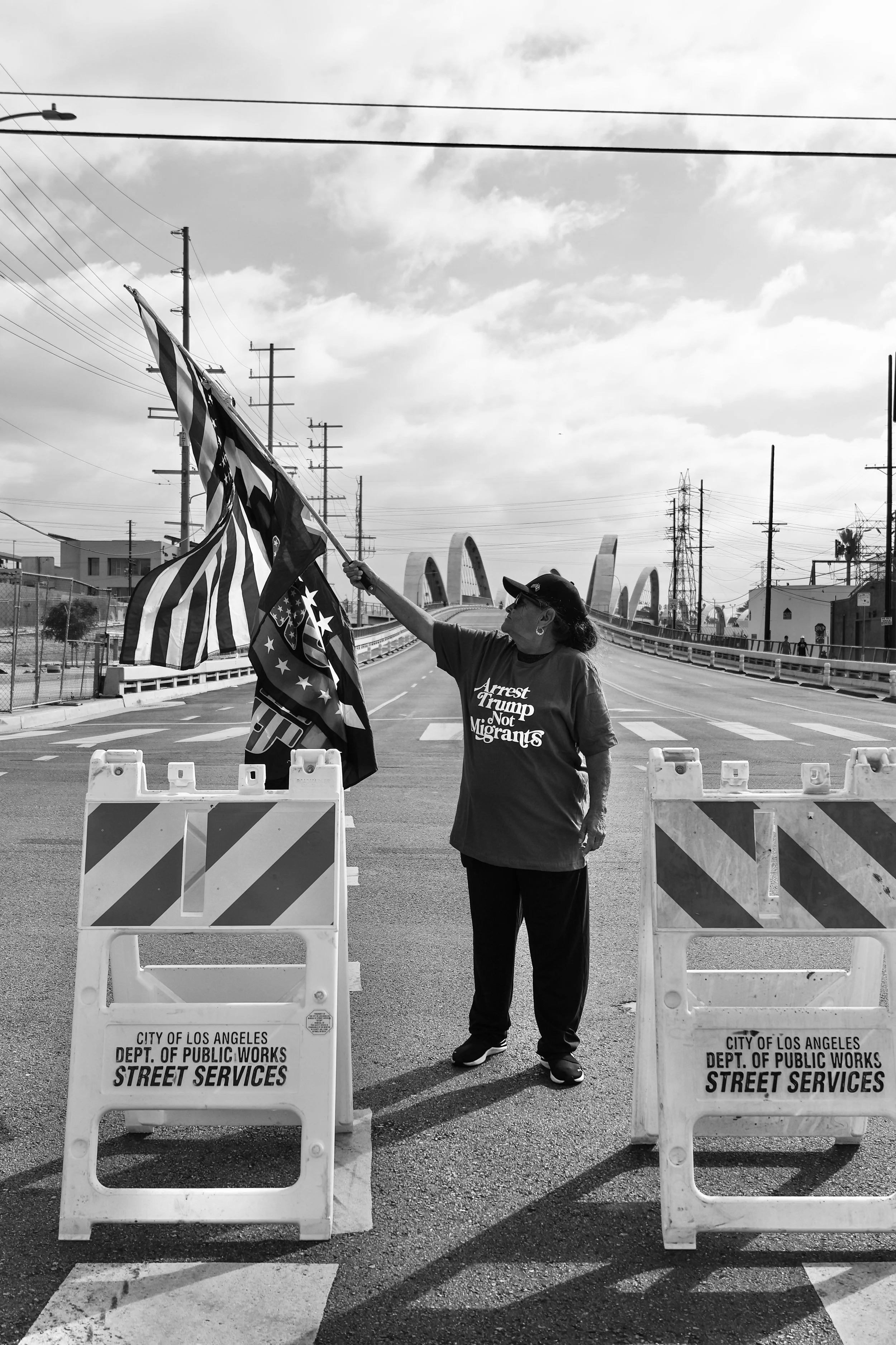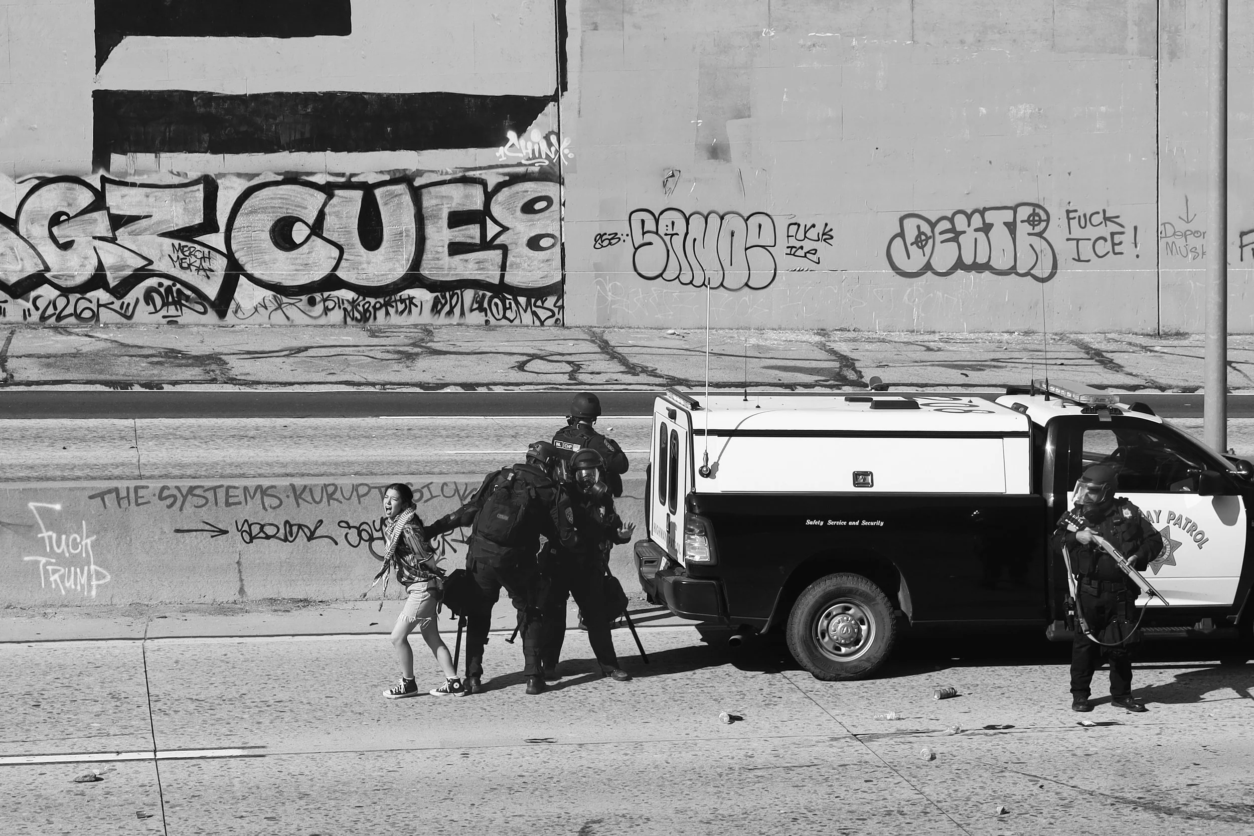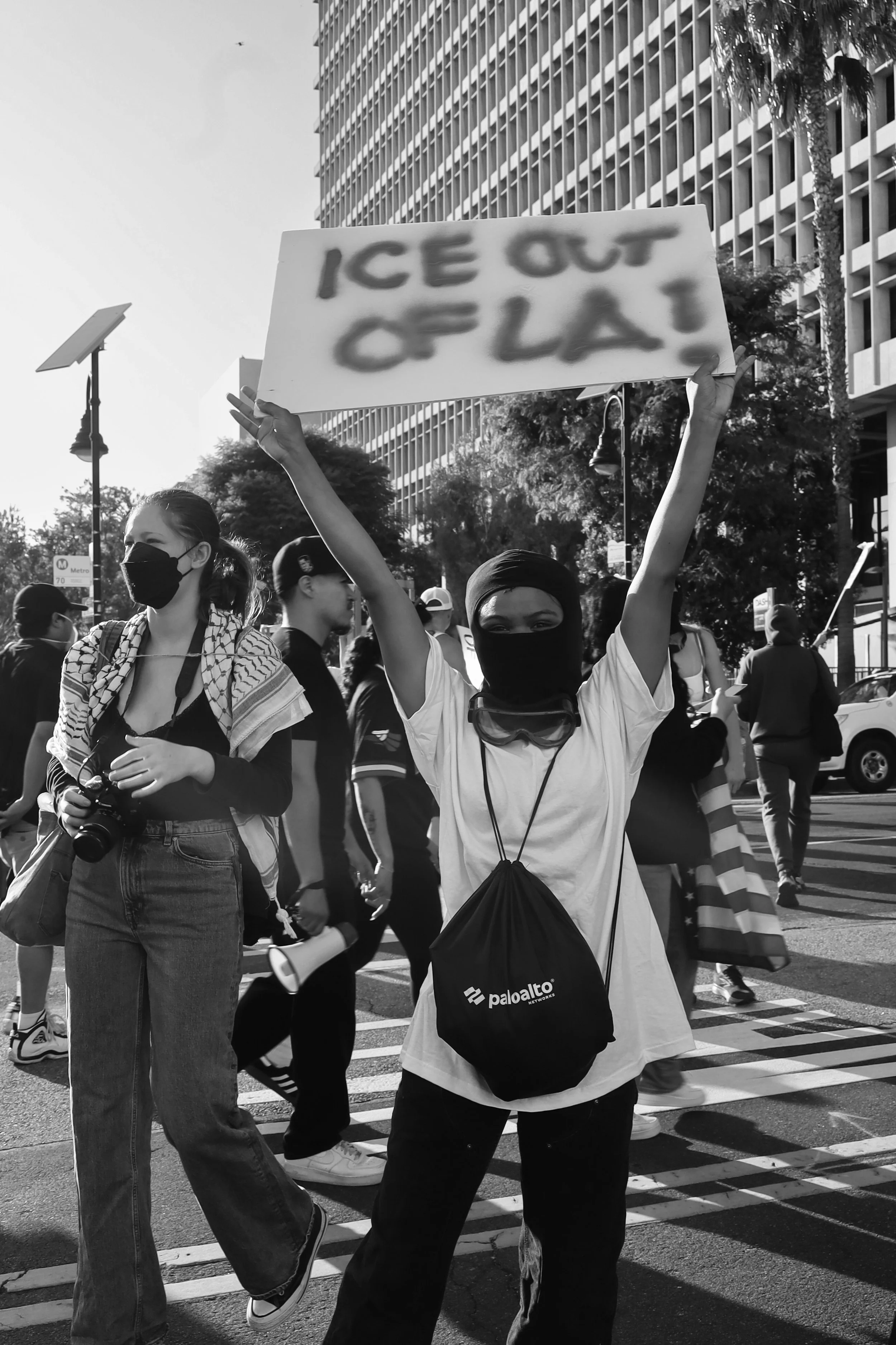 These photographs were taken throughout Los Angeles during the height of nationwide protests against the Trump administration’s anti-immigrant agenda. From freeway shutdowns to downtown marches, communities rose in collective resistance to denounce ICE raids, mass deportations, and the inhumane treatment of immigrants in detention.