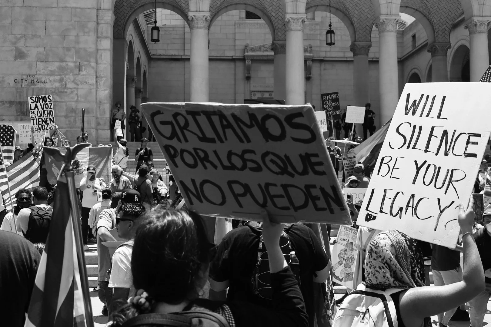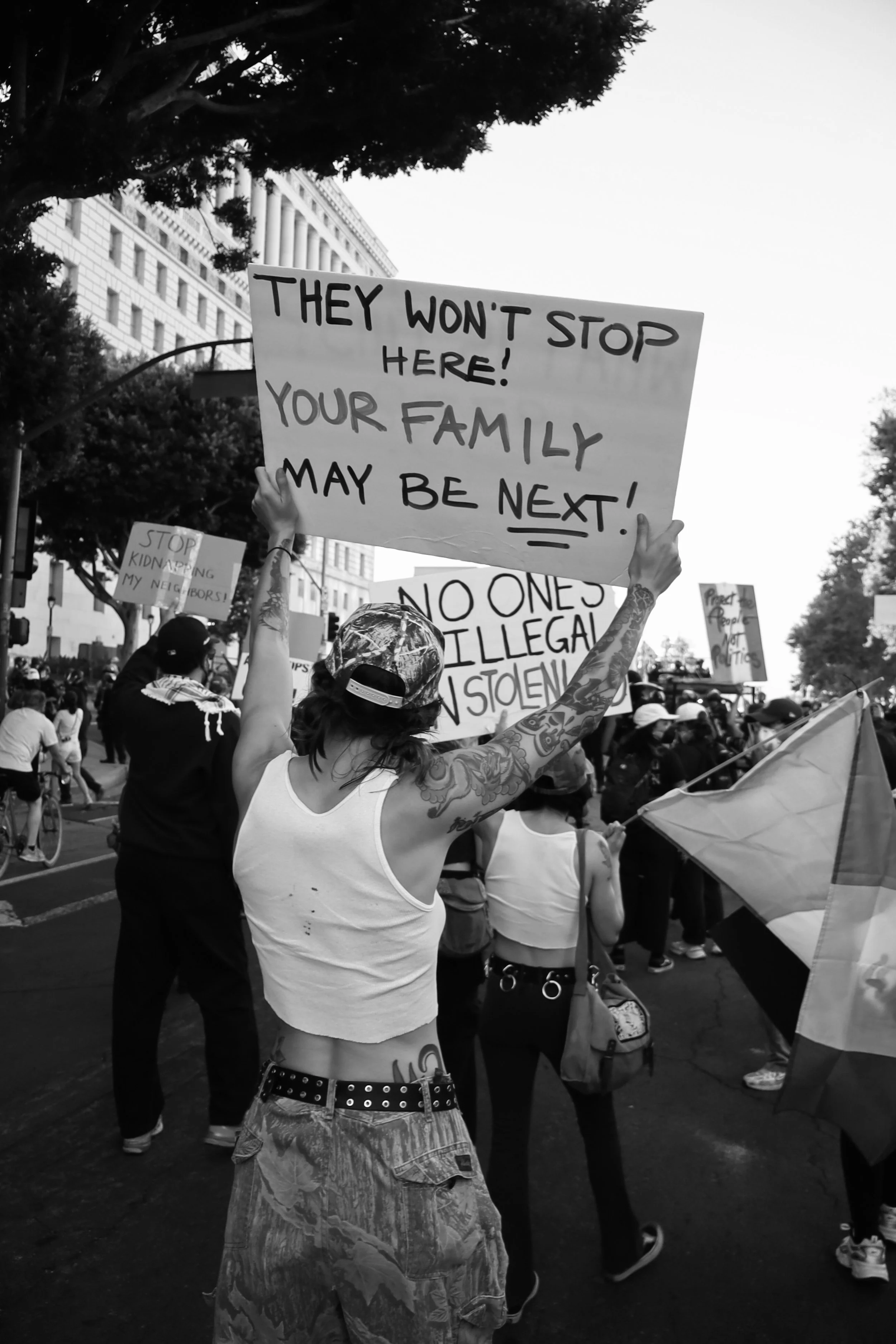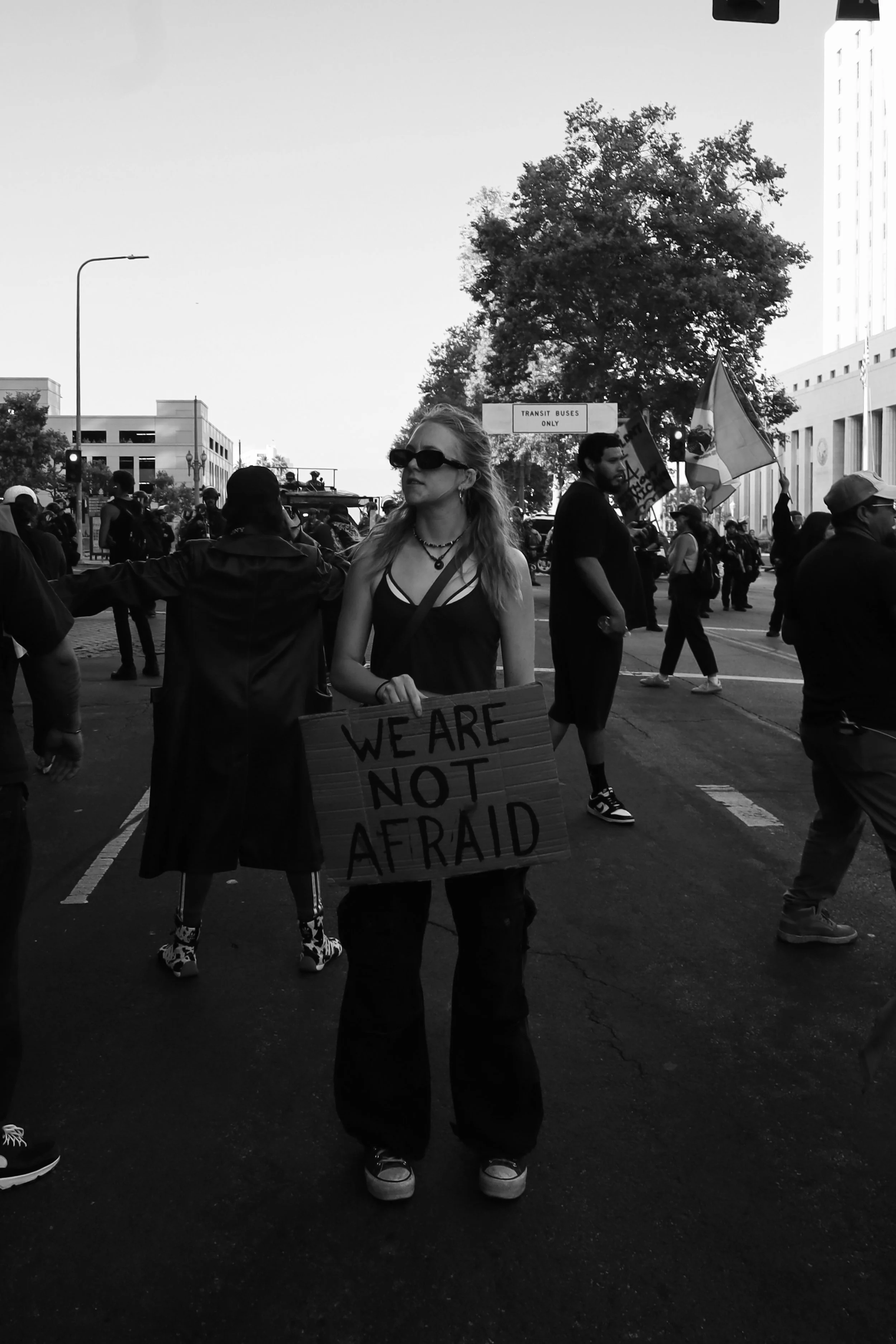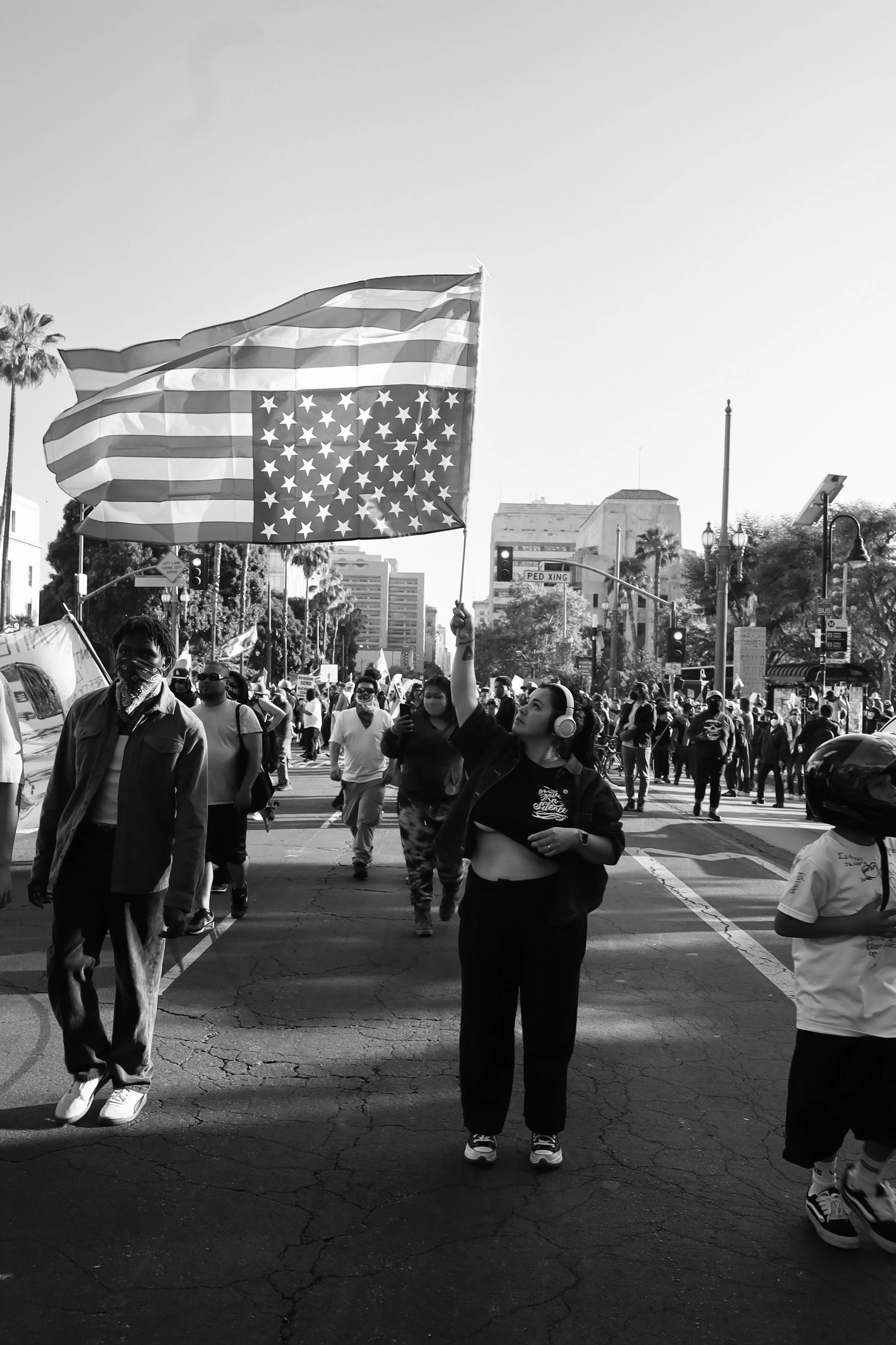 These photographs were taken throughout Los Angeles during the height of nationwide protests against the Trump administration’s anti-immigrant agenda. From freeway shutdowns to downtown marches, communities rose in collective resistance to denounce ICE raids, mass deportations, and the inhumane treatment of immigrants in detention.